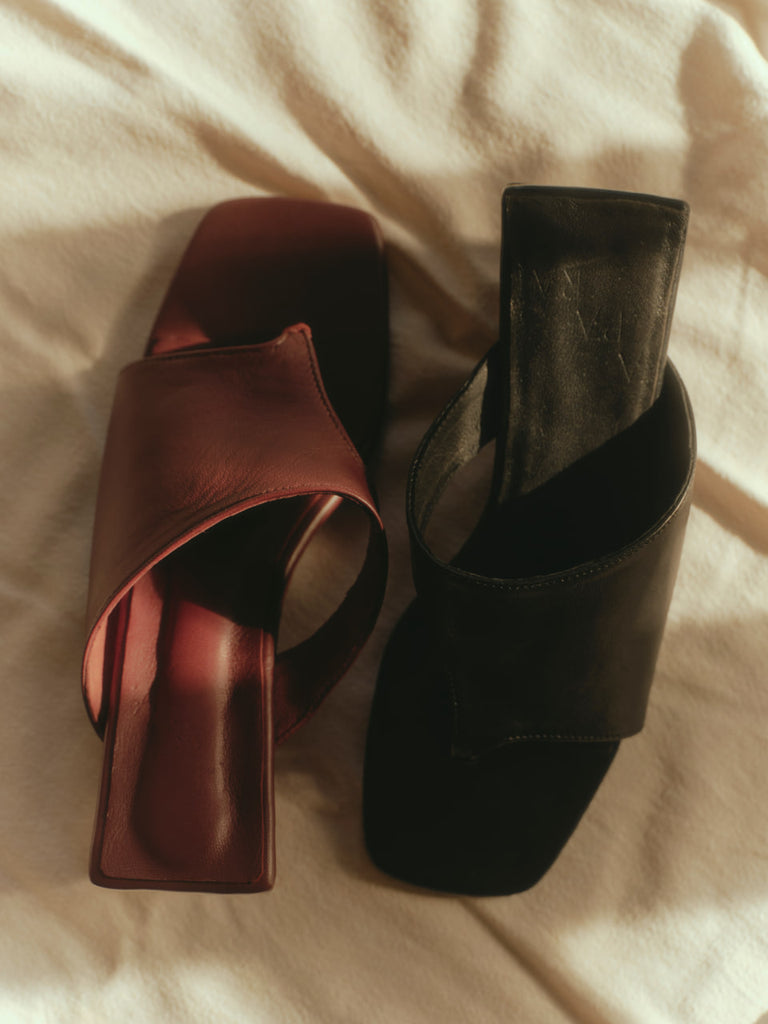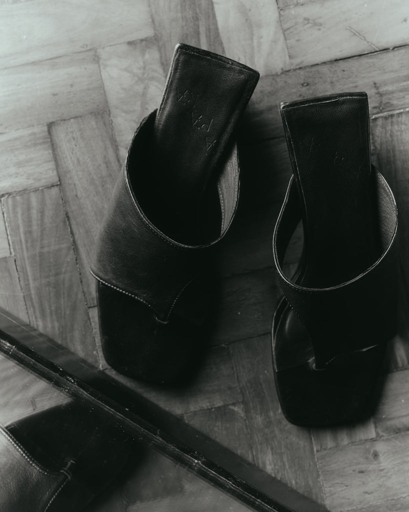 A wedged heel featuring an asymmetrical thong strap. Material is a supple kid leather.