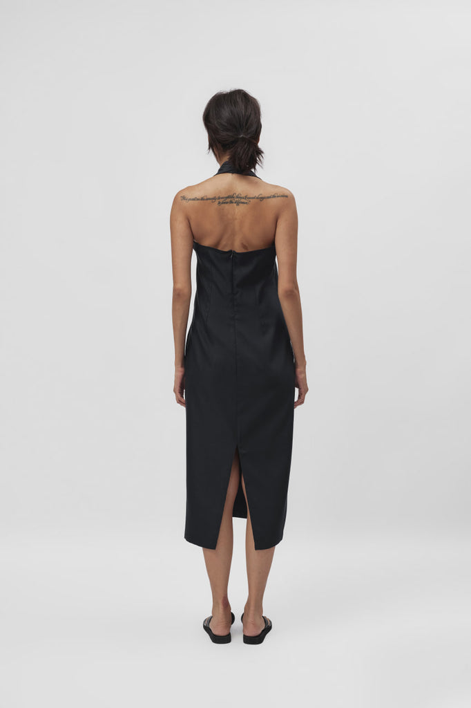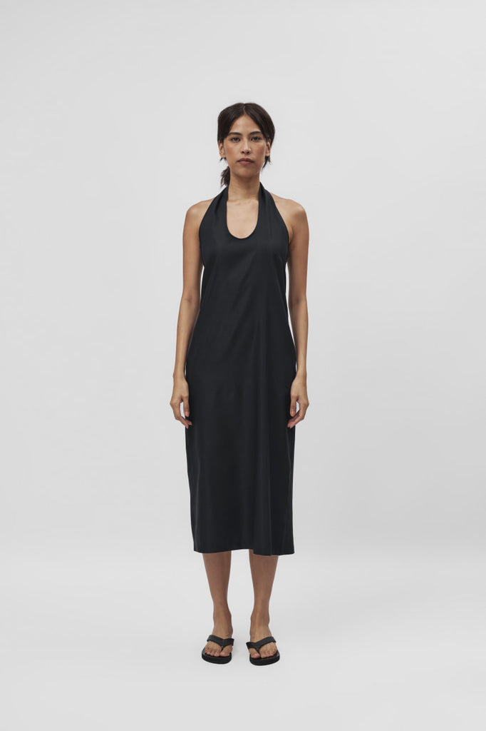 A sleeveless halter dress designed to fall to the ankle. Features a back zipper and back slit for ease of wear. Material is a heavyweight woven cotton.
