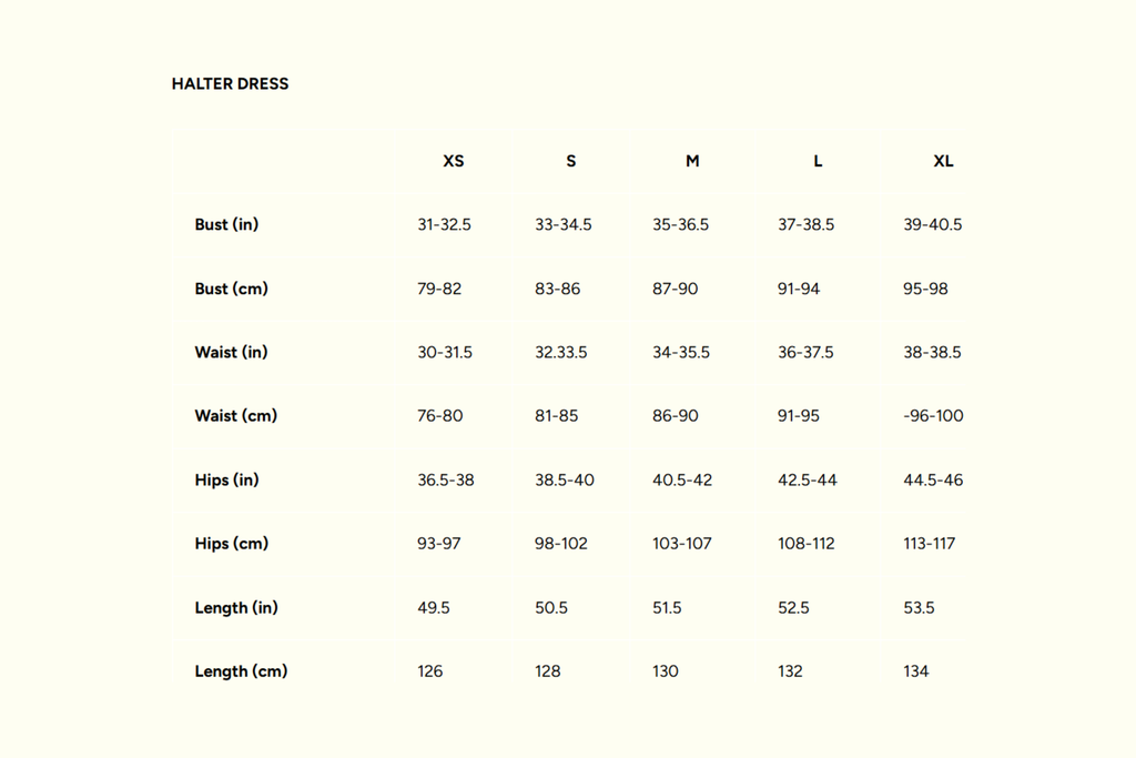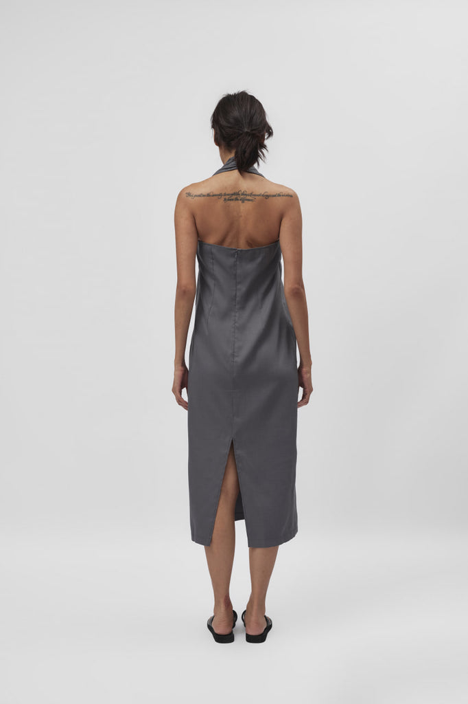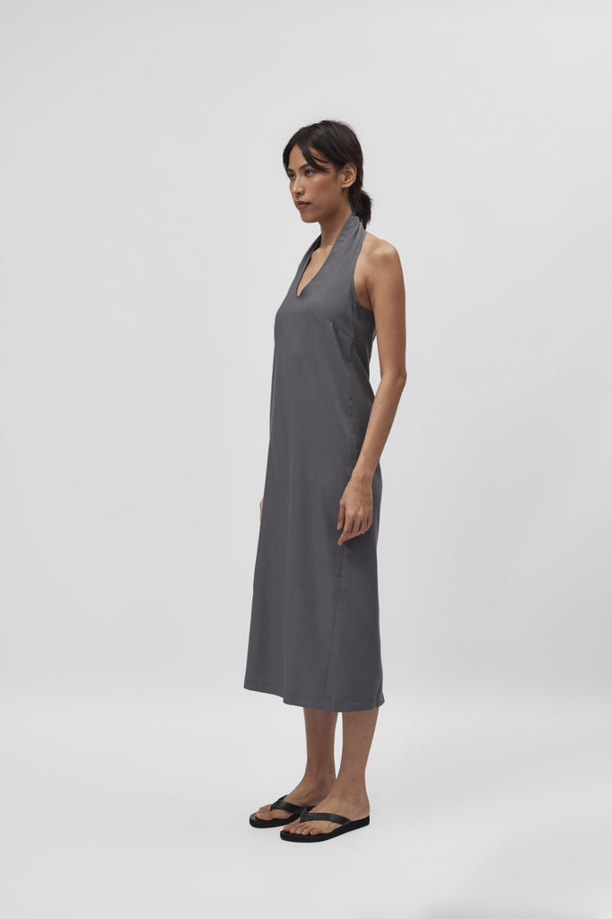 A sleeveless halter dress designed to fall to the ankle. Features a back zipper and back slit for ease of wear. Material is a heavyweight woven cotton.