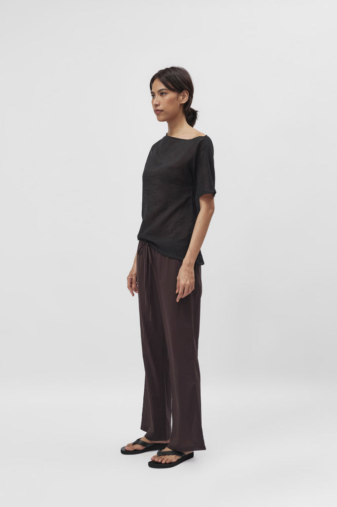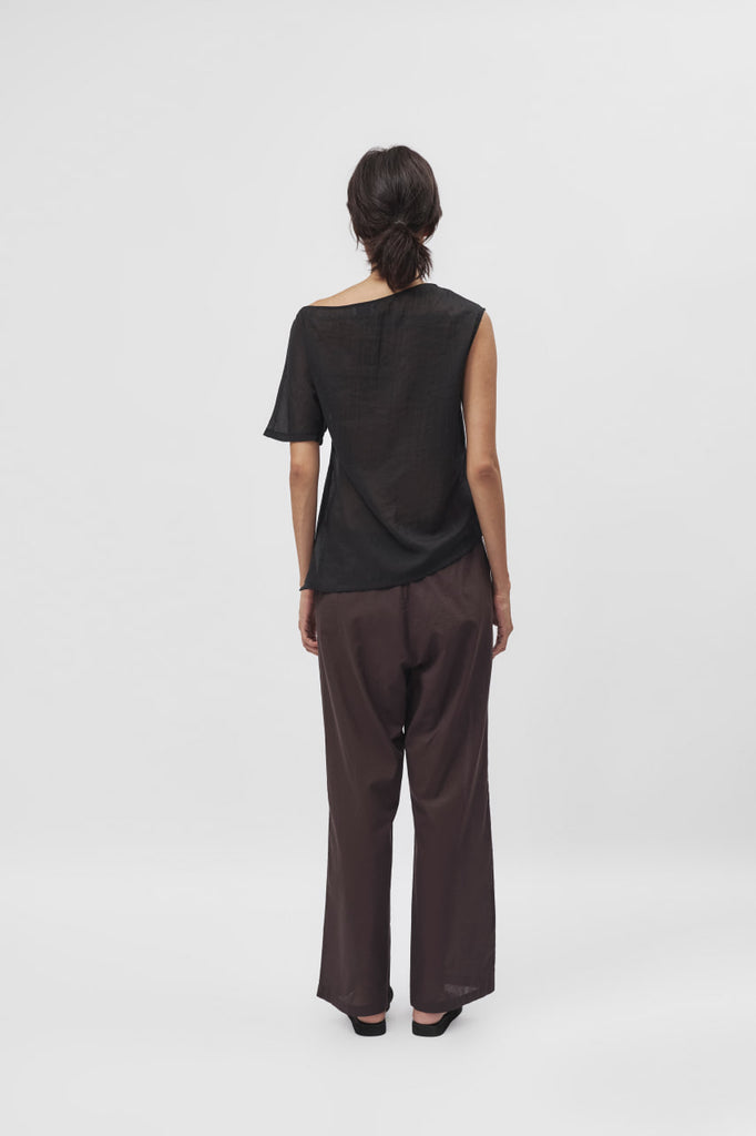 A three-quarter sleeved top with an asymmetrical neckline and hem. Material is a lightweight organza.