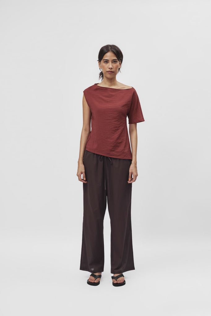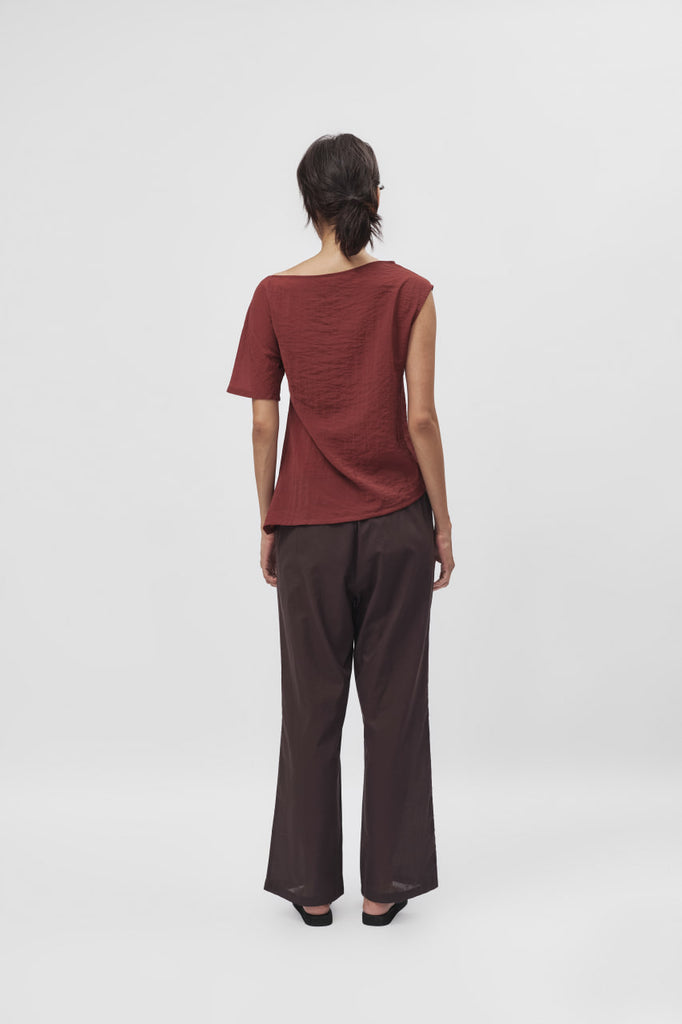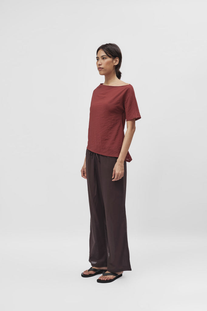 A three-quarter sleeved top with an asymmetrical neckline and hem. Material is a lightweight organza.