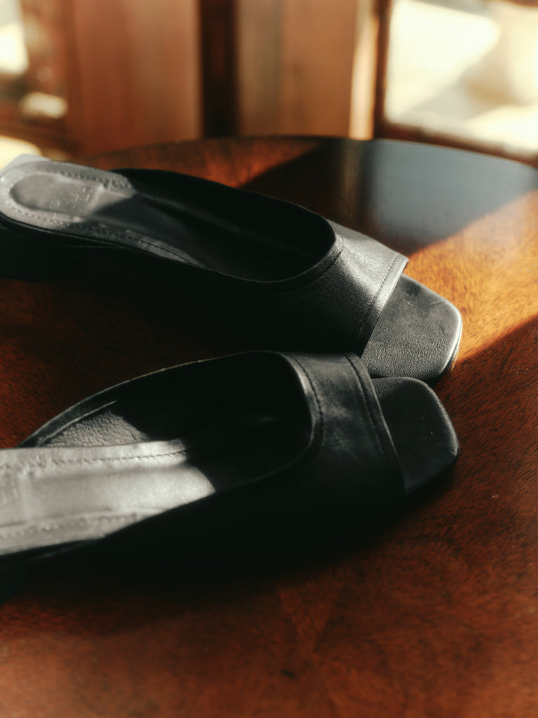 A single-strap sandal with a semi-square edge and a sculpted square heel. Material is a supple kid leather.
