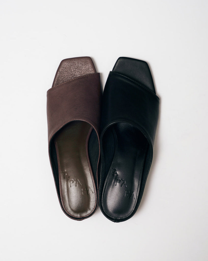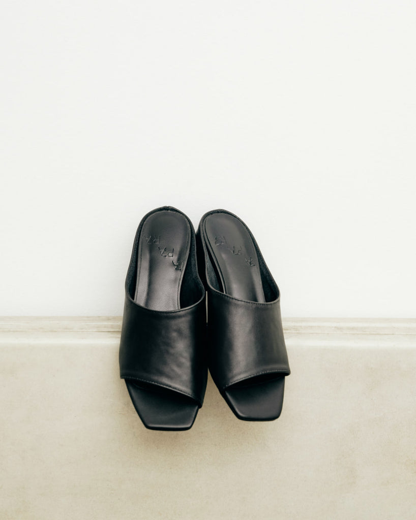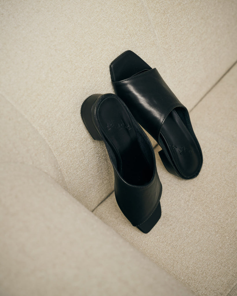 Asymmetrical block heels in smooth kid leather with pig skin lining. Designed with a padded insole for long wear.
