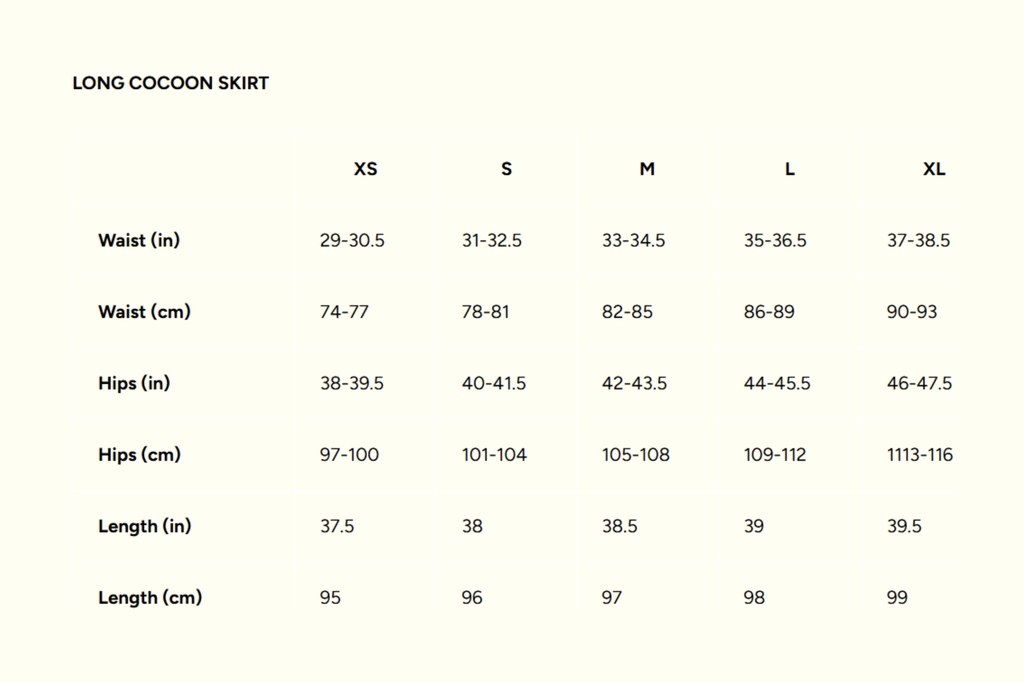 An extended cocoon style skirt designed to fall on or below the ankle. Features a back zipper with side pockets. Model is 5'9 and is wearing size XS. Take your normal size for a mid- to low-waist fit.