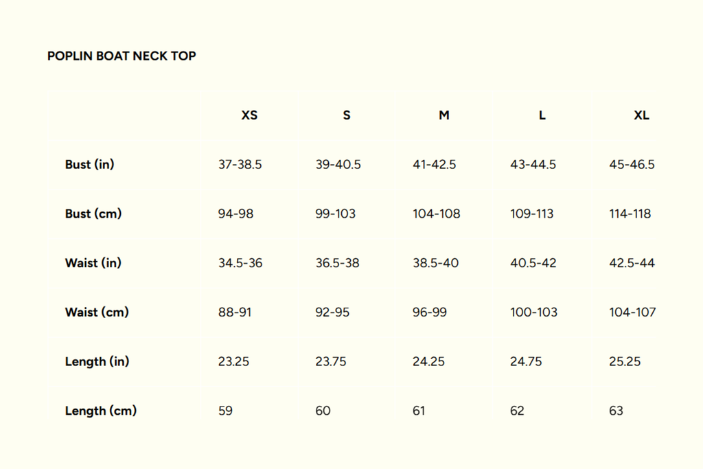 A long sleeve top with a boat neck cut designed with hidden buttons and a curved bottom hem. Material is a cotton poplin fabric. Model is 5'9 and wearing a size S.