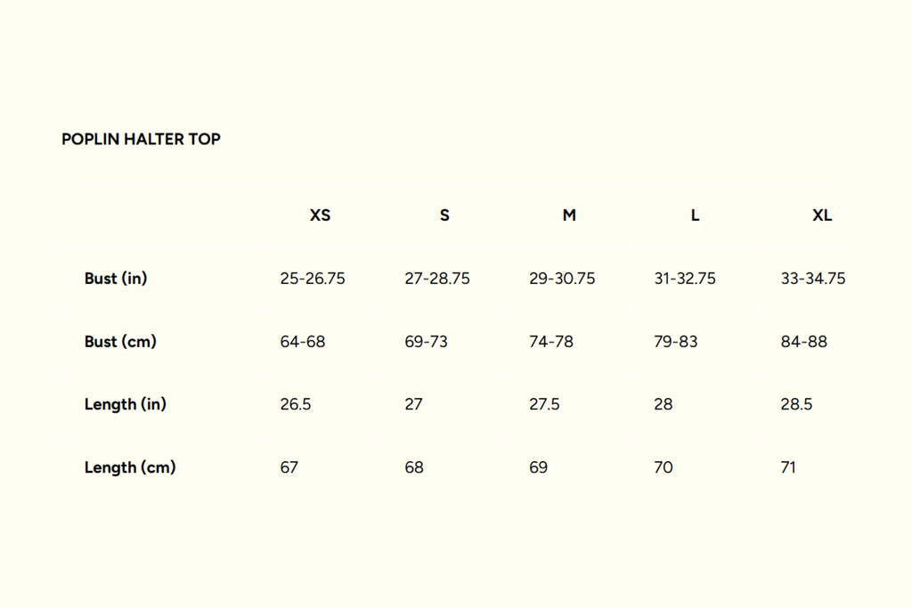 A halter top featuring a concealed button flap and long wrap ties at the front for an adjustable fit. Material is 100% cotton poplin.