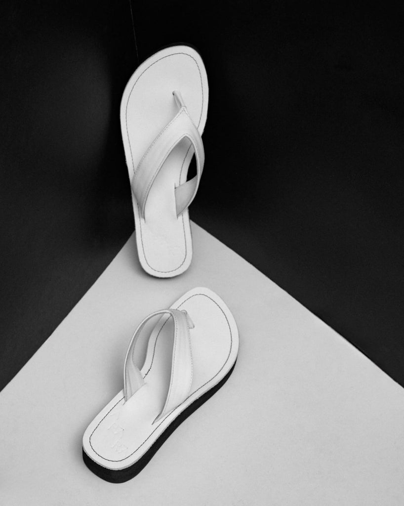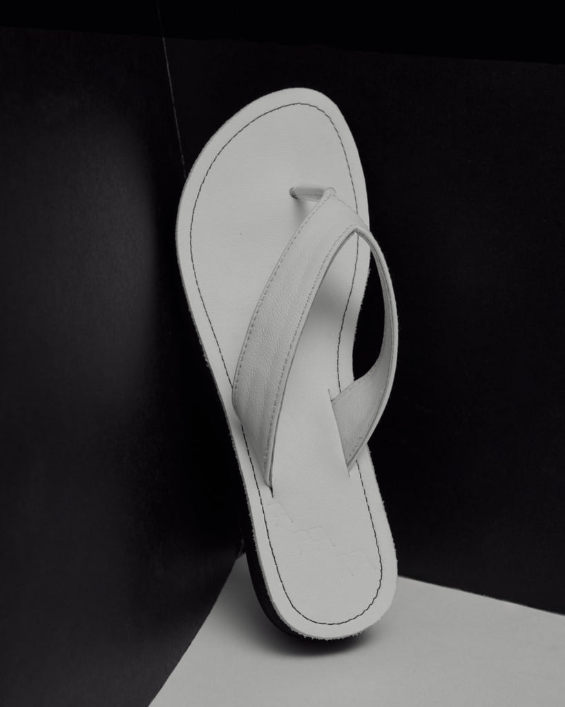 Thong sandals in smooth cowhide leather with subtle stitched detailing and a durable rubber sole. Designed with a gently sloped toe to elongate the leg with ease.